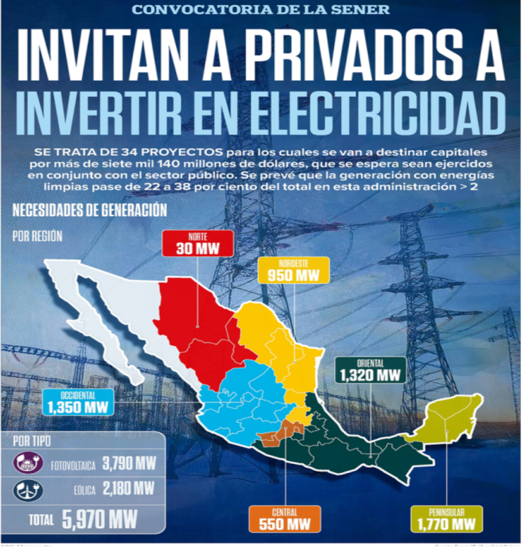 De acuerdo con la información de la sección financiera de Excélsior, la Secretaría de Energía (Sener) lanzó la primera convocatoria para llevar a cabo, lo antes posible, los primeros proyectos de generación eléctrica, considerados prioritarios para satisfacer la demanda y garantizar la seguridad energética del país, los cuales espera se lleven a cabo en conjunto con las empresas privadas a quienes les solicitó su “apoyo” y participación.